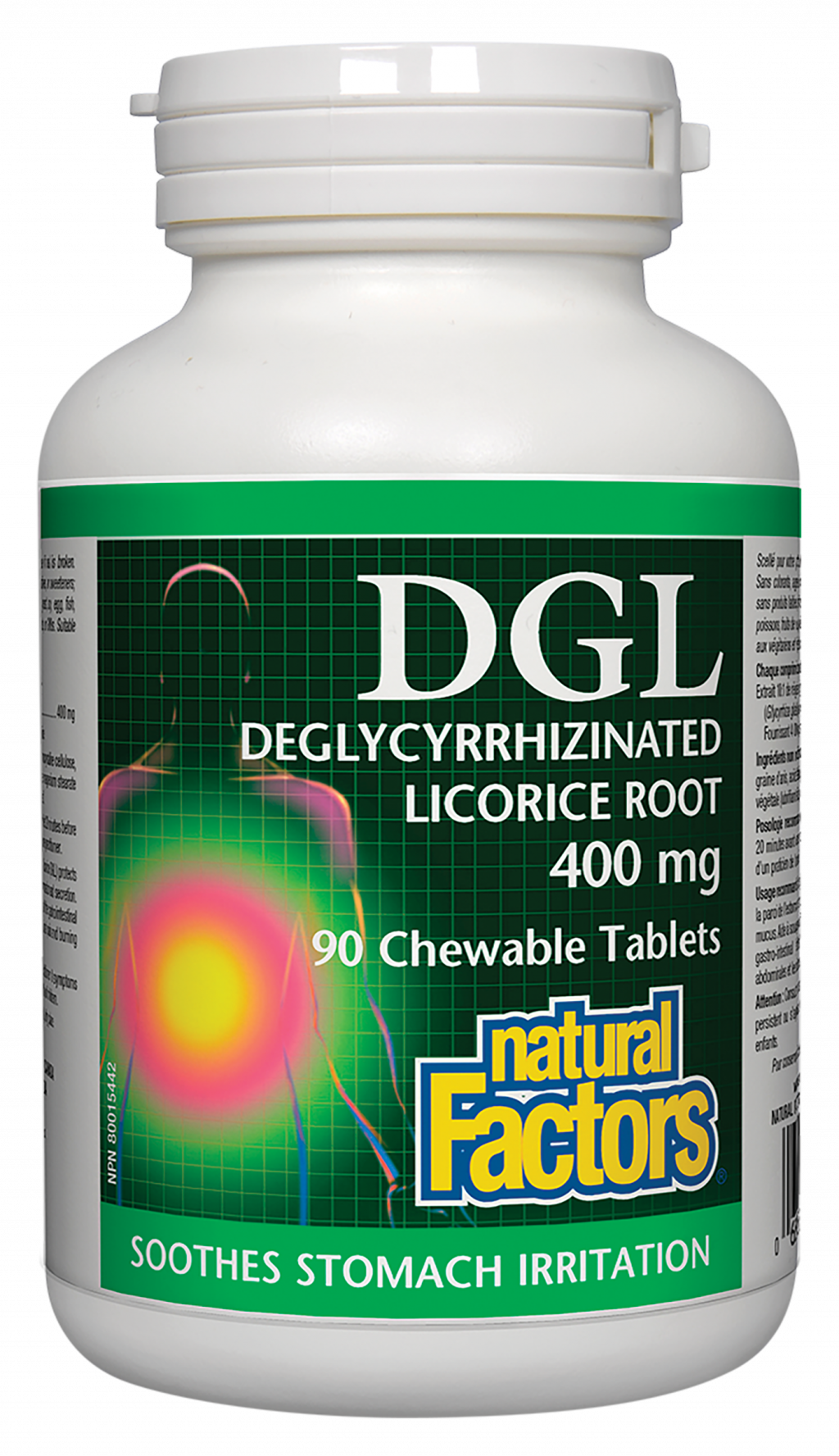 Natural Factors DGL Licorice Root Extract aids digestion and treats stomach complaints, including heartburn and indigestion. It soothes and protects the stomach lining, helping to heal ulcers and prevent their recurrence.