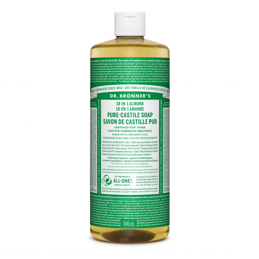 Face, body, hair — food, dishes, laundry, mopping, pets — ??r. Bronner’s pure-castile soaps are the very best for human, home and earth! Only the purest, most effective organic and fair trade ingredients — hemp oil creates soft, smooth lather that won’t dry skin. effective, ecological, versatile— vegan and cruelty- free— no harsh synthetics! — 100% biodegradable in 100% post-consumer recycled bottle. True to the vis- ion of Dr. E.H. Bronner and 158 years of soapmaking tradition: Work hard! Improve! Make the best better!