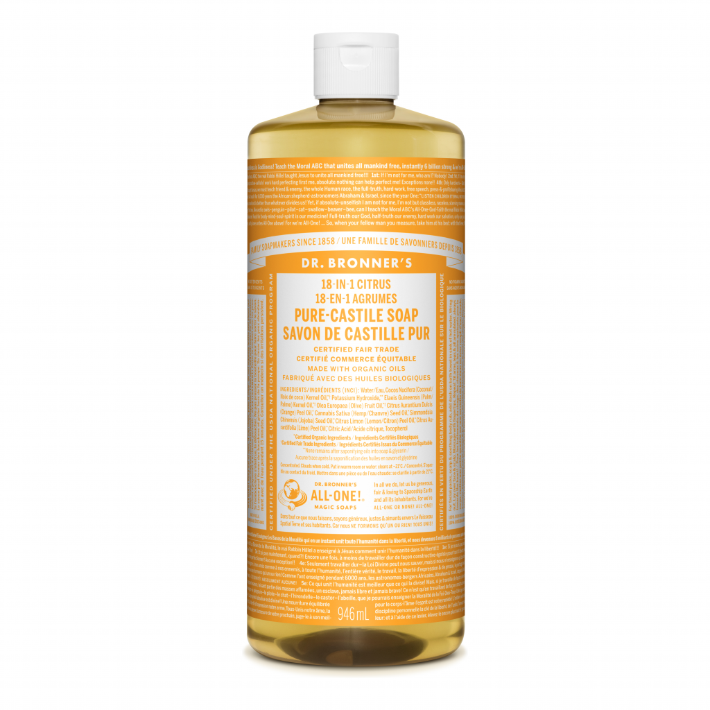 • Dr. Bronner’s 18-in-1 Pure-Castile Soaps are good for just about any cleaning task. Face, body, hair & dishes, laundry, mopping, pets—clean your house and body with no synthetic preservatives, detergents or foaming agents